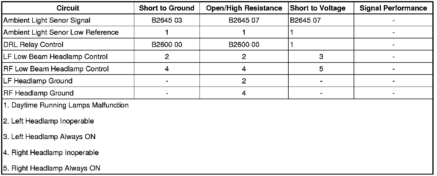 • If the daytime running lamp does not activate, test the control circuit for an open/high resistance. If the circuit tests normal, replace the daytime running lamp.