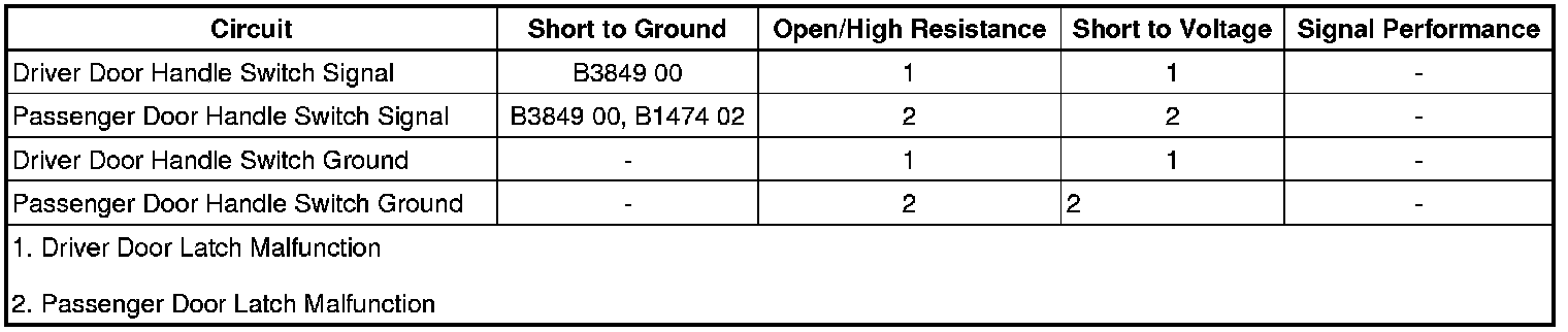 The exterior door handle switch signal circuit provides inputs to their respective door lock/window switch when the exterior door handle switch is activated. This input allows the door lock/window switch to detect a door open request. The door lock/window switch provides voltage to the exterior door handle switch via the front door handle switch signal circuit. When the front door handle is activated, the switch closes and the voltage signals from the door lock/window switch are pulled to ground.