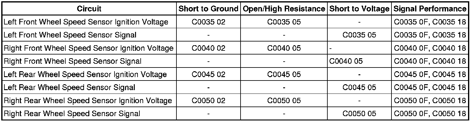 * A short to ground, open/high resistance is detected on the wheel speed sensor signal circuit.