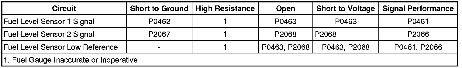 The primary fuel level sender and the secondary fuel level sender changes resistance based on fuel level. The engine control module (ECM) monitors the signal circuits of the primary fuel level sender and the secondary fuel level sender in order to determine the fuel level. When the fuel tank is full, the resistances of both fuel level senders are low and the ECM senses a low signal voltage on both the signal circuits of the primary fuel level sender and the secondary fuel level sender. When the fuel tanks are empty, the resistances of the fuel level senders are high and the ECM senses a high signal voltage. The ECM uses the signal circuits of the primary fuel level sender and the secondary fuel level sender in order to calculate the percentage of remaining fuel in the tank. The ECM sends the fuel level percentage via serial data circuit to the instrument cluster in order to control the fuel gauge.