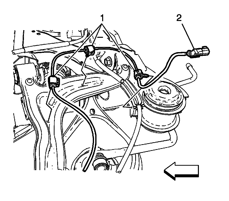 3. Remove the wheel speed sensor wire harness clips (1) from the upper control arm and vehicle frame.