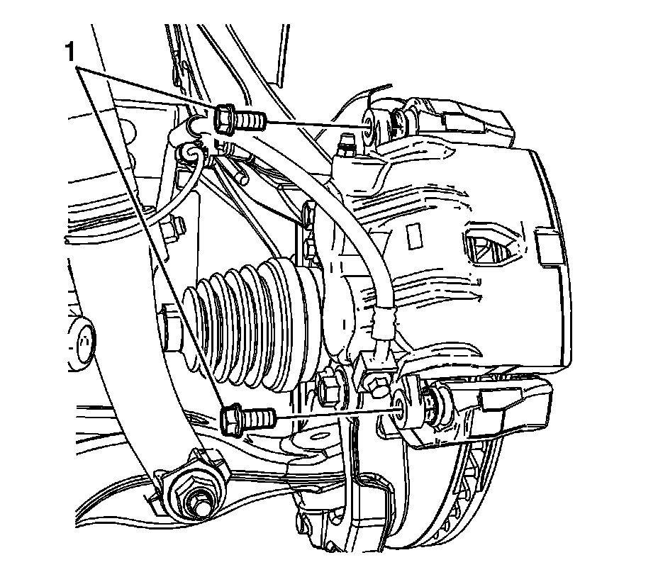 Caution: Support the brake caliper with heavy mechanic wire, or equivalent, whenever it is separated from its mount and the hydraulic flexible brake hose is still connected. Failure to support the caliper in this manner will cause the flexible brake hose to bear the weight of the caliper, which may cause damage to the brake hose and in turn may cause a brake fluid leak.
