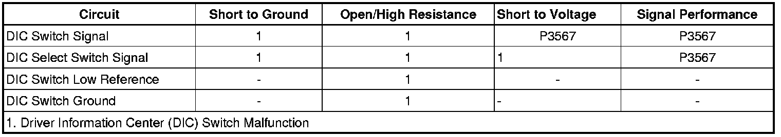 The driver information center (DIC) switch is a multiplexed switch. Battery power is provided to the DIC switch via the instrument panel cluster (IPC) with the DIC switch signal circuit pulled up to battery voltage in the IPC. The IPC also provides the DIC switch with a ground reference. The switch input to the IPC is pulled low or grounded when a switch is activated. The DIC switch is a momentary contact switch that connects a series of resistors in a resistor ladder format. The IPC monitors the DIC switch signal circuit to determine the DIC switch inputs. Each switch state - Set/Reset, Trip/Fuel, Vehicle Information, Personalization, INFO UP, INFO DOWN - corresponds to a certain resistance value. The IPC determines the switch pressed by the voltage drop across the resistors. A stuck switch or a short to battery sets a DTC.