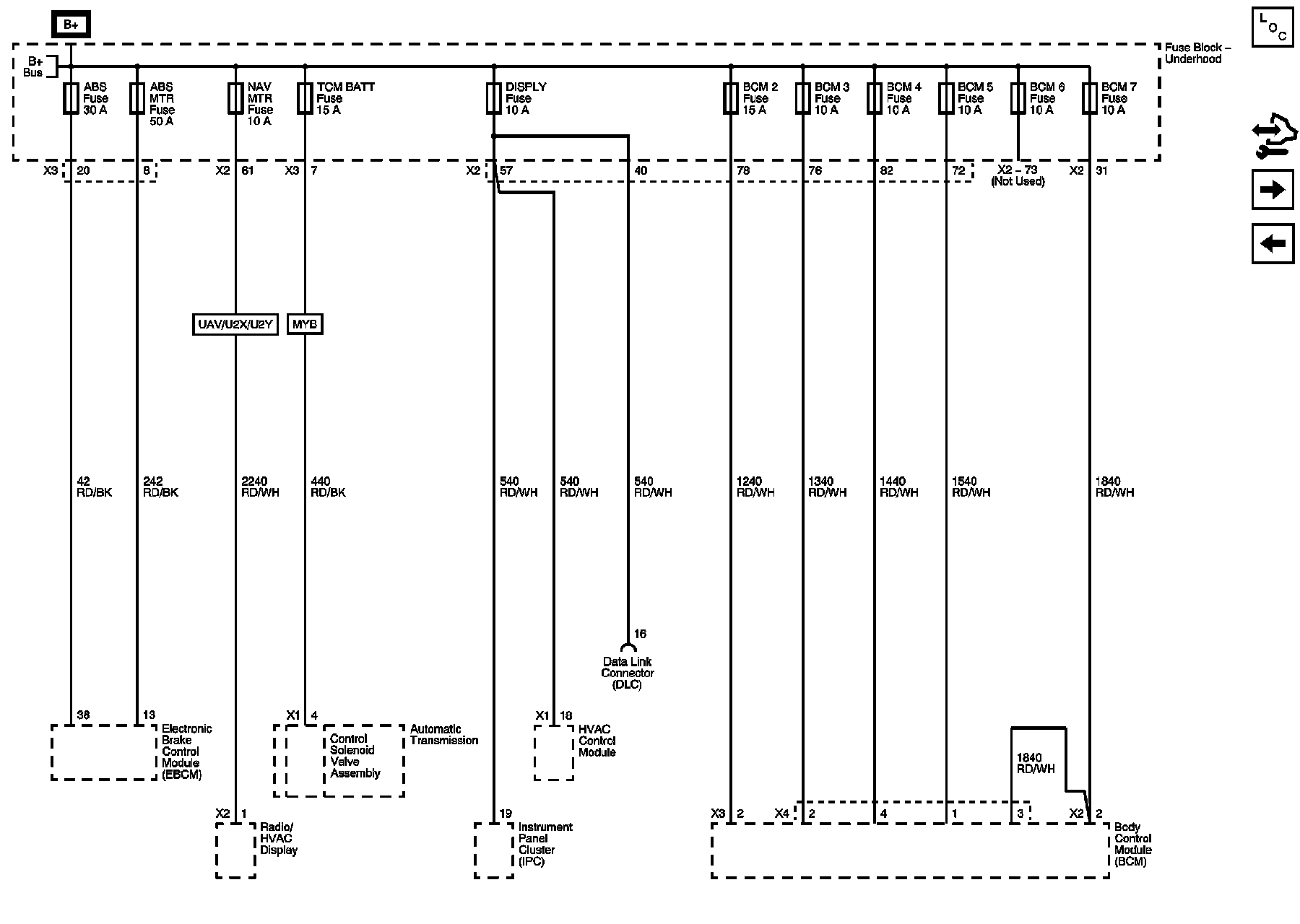 ABS, ABS MTR, BCM 2, BCM 3, BCM 4, BCM 5, BCM 6, BCM 7, DISPLAY, HTD WASH, NAV MTR, and TCM BATT Fuses