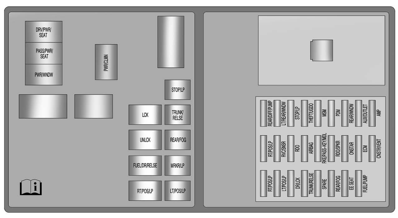 The rear compartment fuse block is located on top of the battery, on the right side of the trunk. The battery access door must be removed to access the fuse block.
