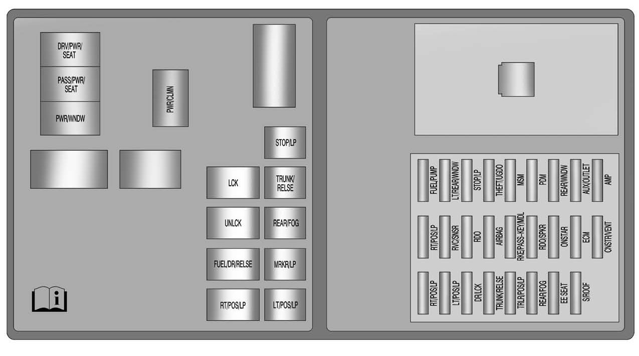 The rear compartment fuse block is located on top of the battery, on the right side of the trunk. The battery access door must be removed to access the fuse block.