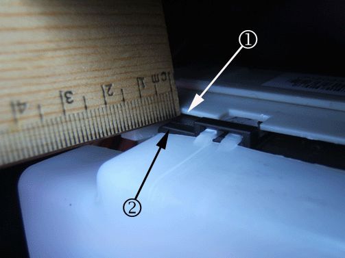 3. Measure the connector in the location shown above to ensure it is fully seated into the fuse block. The measurement should be less than 9 mm (0.35 in) and equal front to rear. Measure the connector engagement between the edge of the fuse block (1) and the edge of the black connector (2). The dimension must be less than 9 mm (0.35 in). If it is not, press the connector into fuse block and take the measurement again.