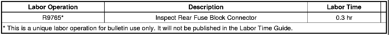 Beginning in about May 2009, a new rear fuse block connector was implemented that has a connector bolt that does not spin freely after it reaches the end of the thread travel. The release of this new connector was staggered based on the vehicle's electrical options, so no definite VIN breakpoint can be provided. If the bolt can reach a torque of 4 +/- 1 Nm (35.4 lb in), it has the new style connector. When servicing this rear fuse block, do not over torque the bolt or it may break the boss for the bolt out of the fuse block. All 2010 model year vehicles have the second design bolt.