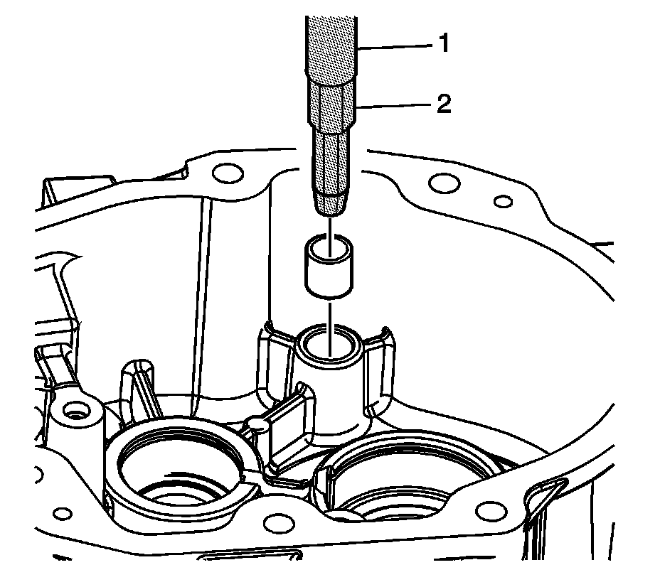 19. Remove the reverse rail bushing using the J 36190 - handle (1) and J 39439-2 - installer (2).