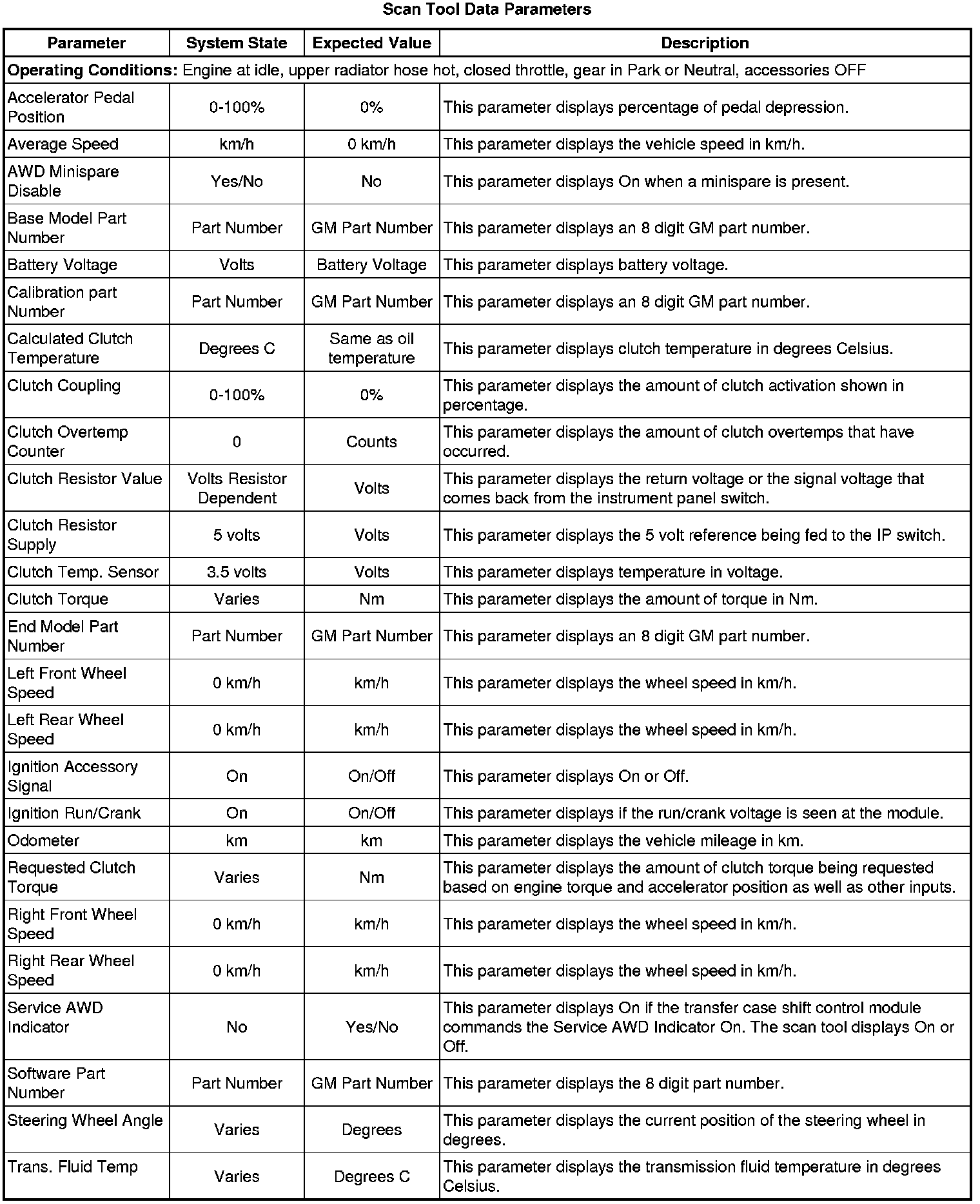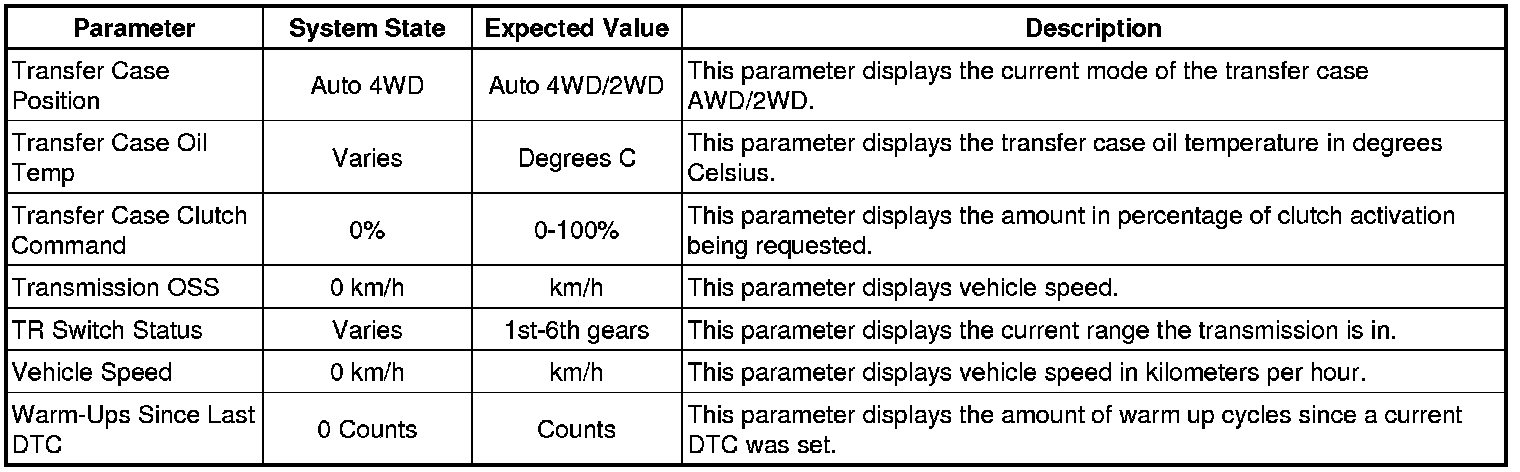 The Transfer Case Shift Control Module Scan Tool Data List contains all transfer case related parameters that are available on the scan tool. The list is arranged in alphabetical order. A given parameter may appear in any one of the data lists, and in some cases may appear more than once, or in more than one data list in order to group certain related parameters together.