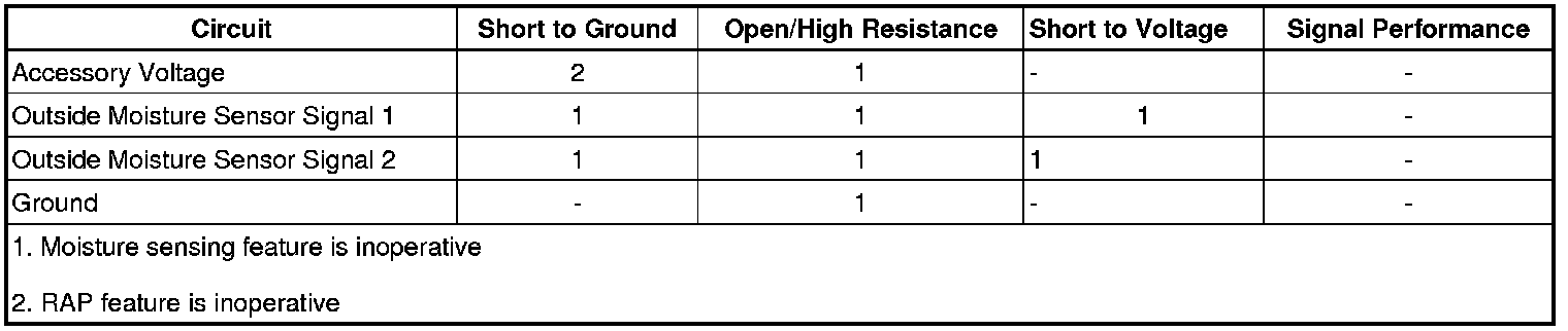 The outside moisture sensor uses the moisture sensor signal 2 circuit to command wiper motor wipe cycles and to confirm the moisture sensor signal 1 is being received. If at anytime communication between the outside moisture sensor and BCM is lost, the BCM will use the inputs from the windshield wiper/washer switch in the delay positions to operate the wiper motor at continuous variable delay intervals.