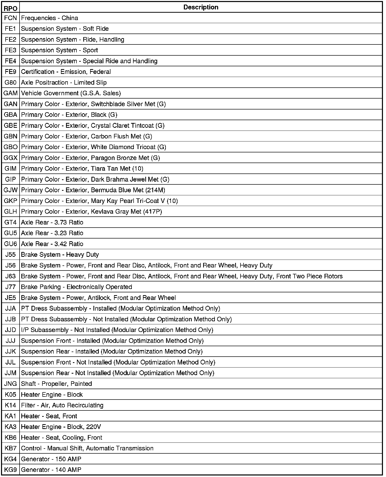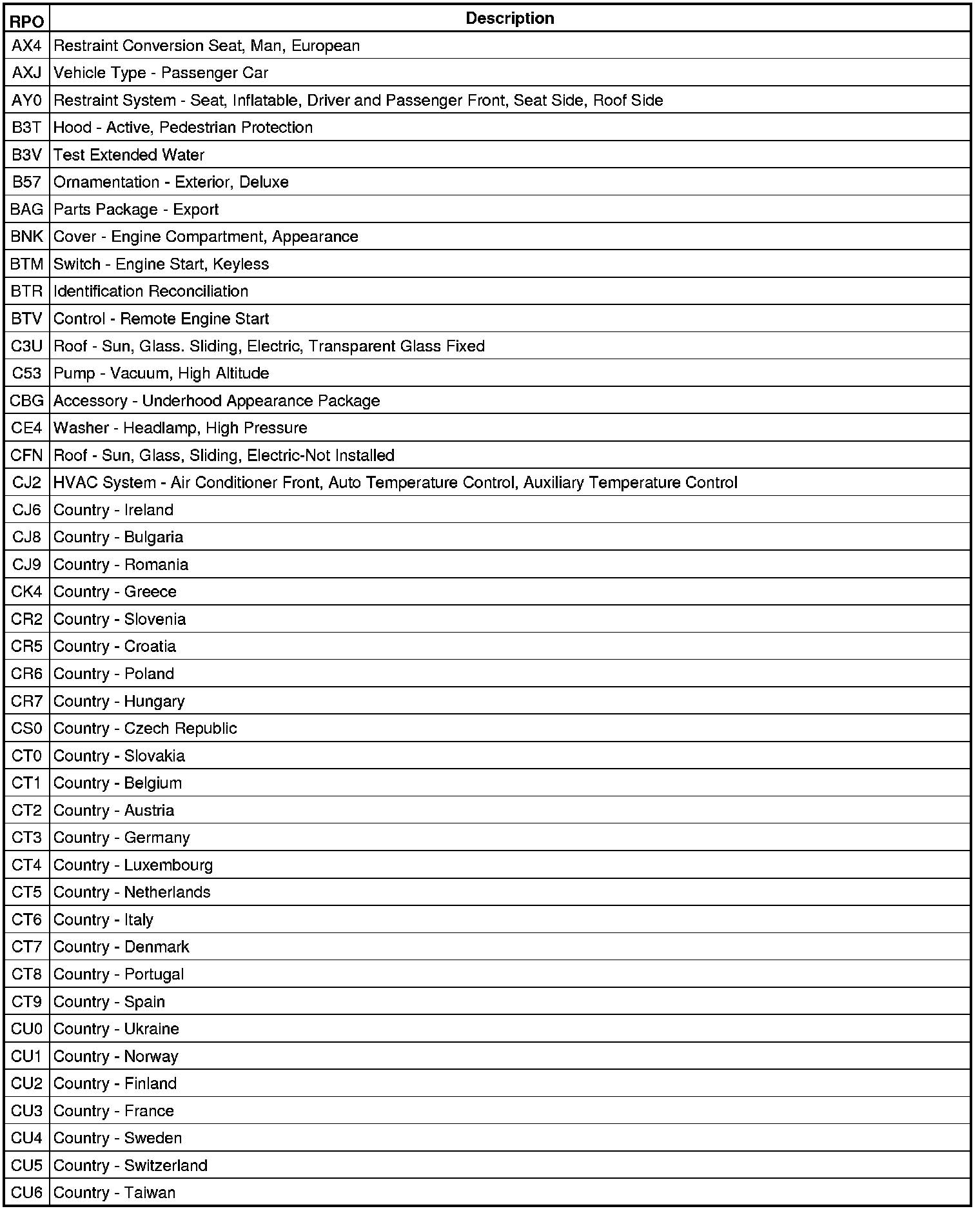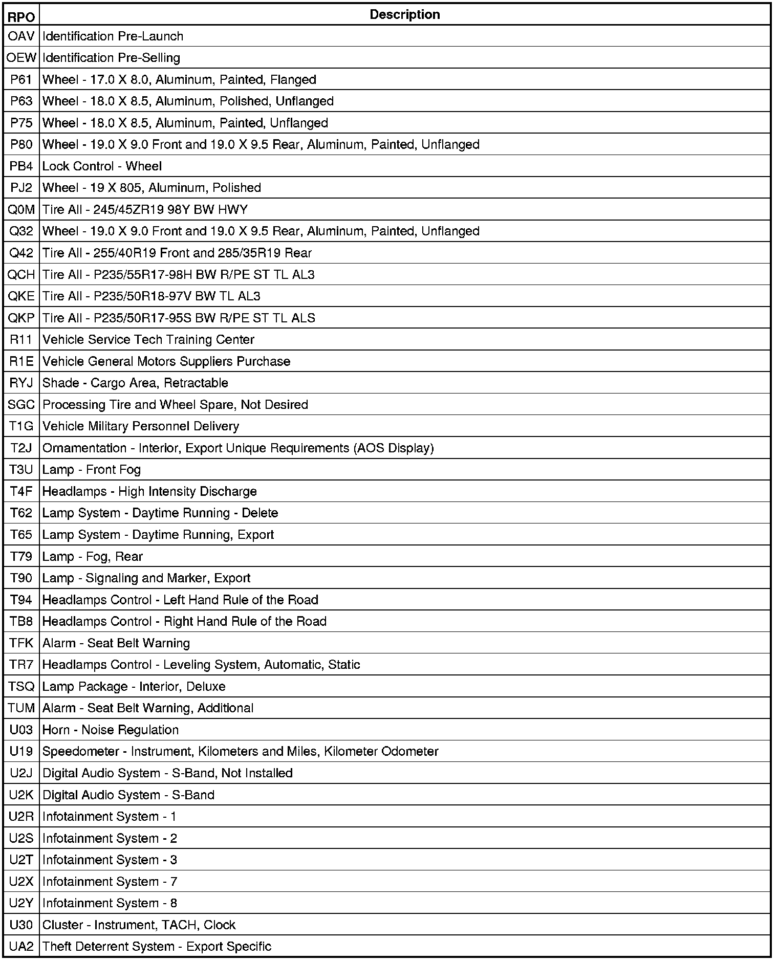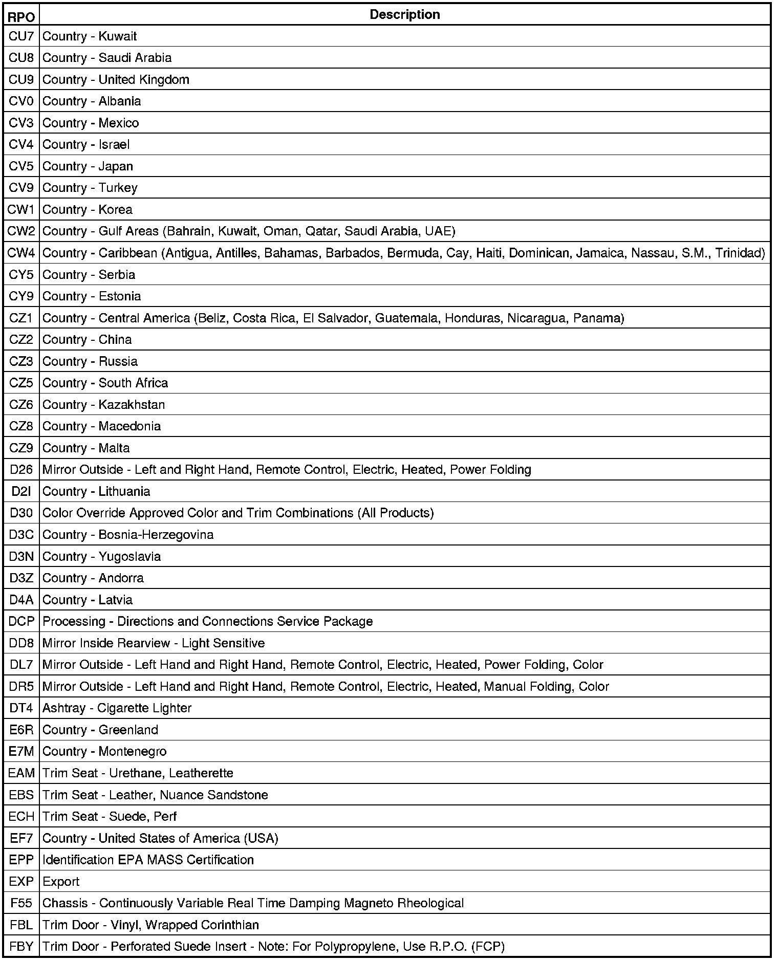 The following table provides the description of the regular production option (RPO) codes that are available on the vehicle. The vehicle's RPO list is printed on the Service Parts Identification Label.