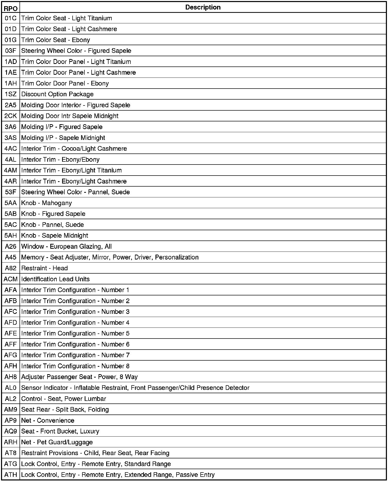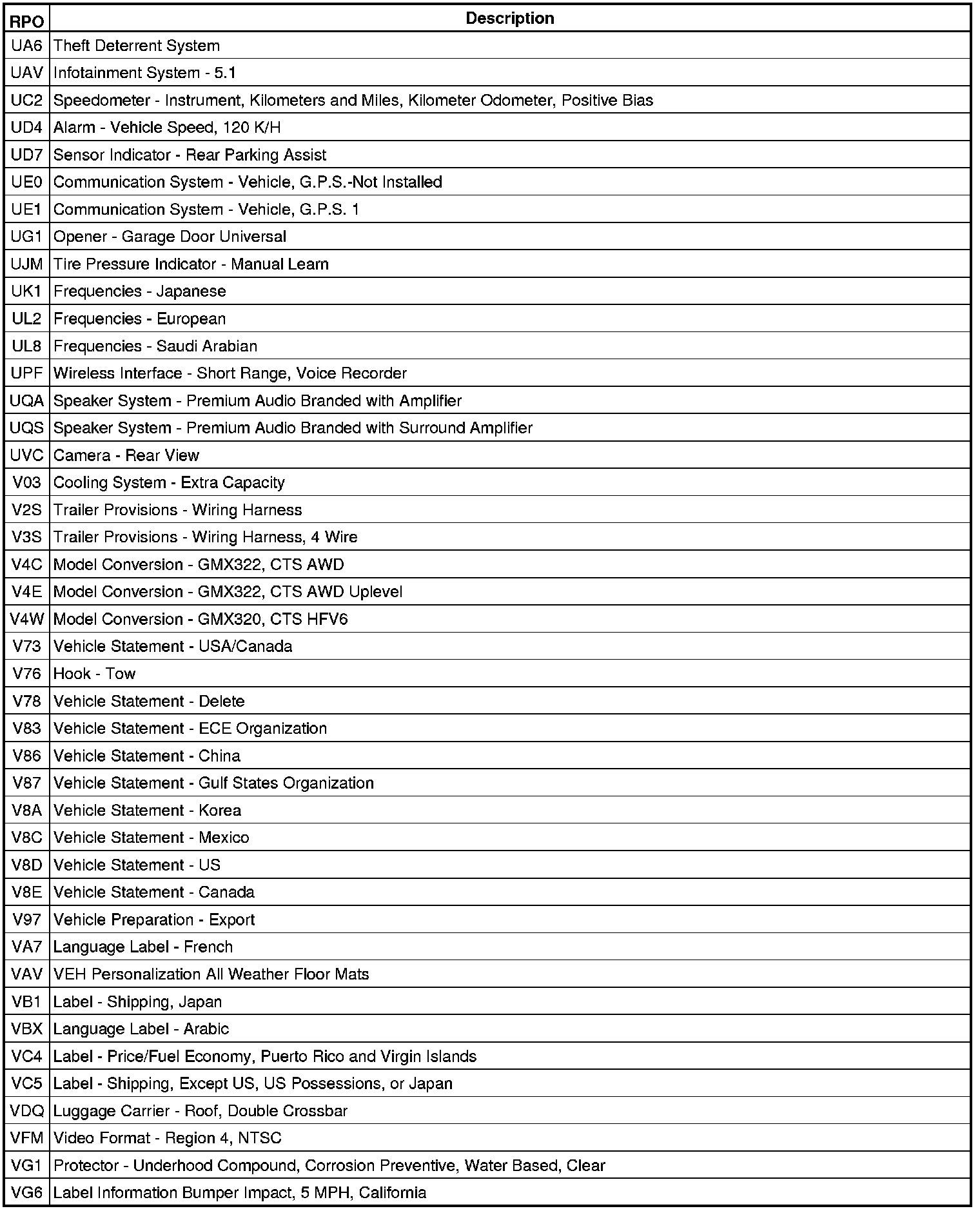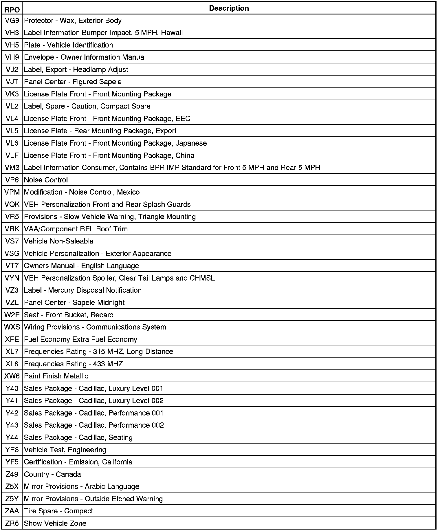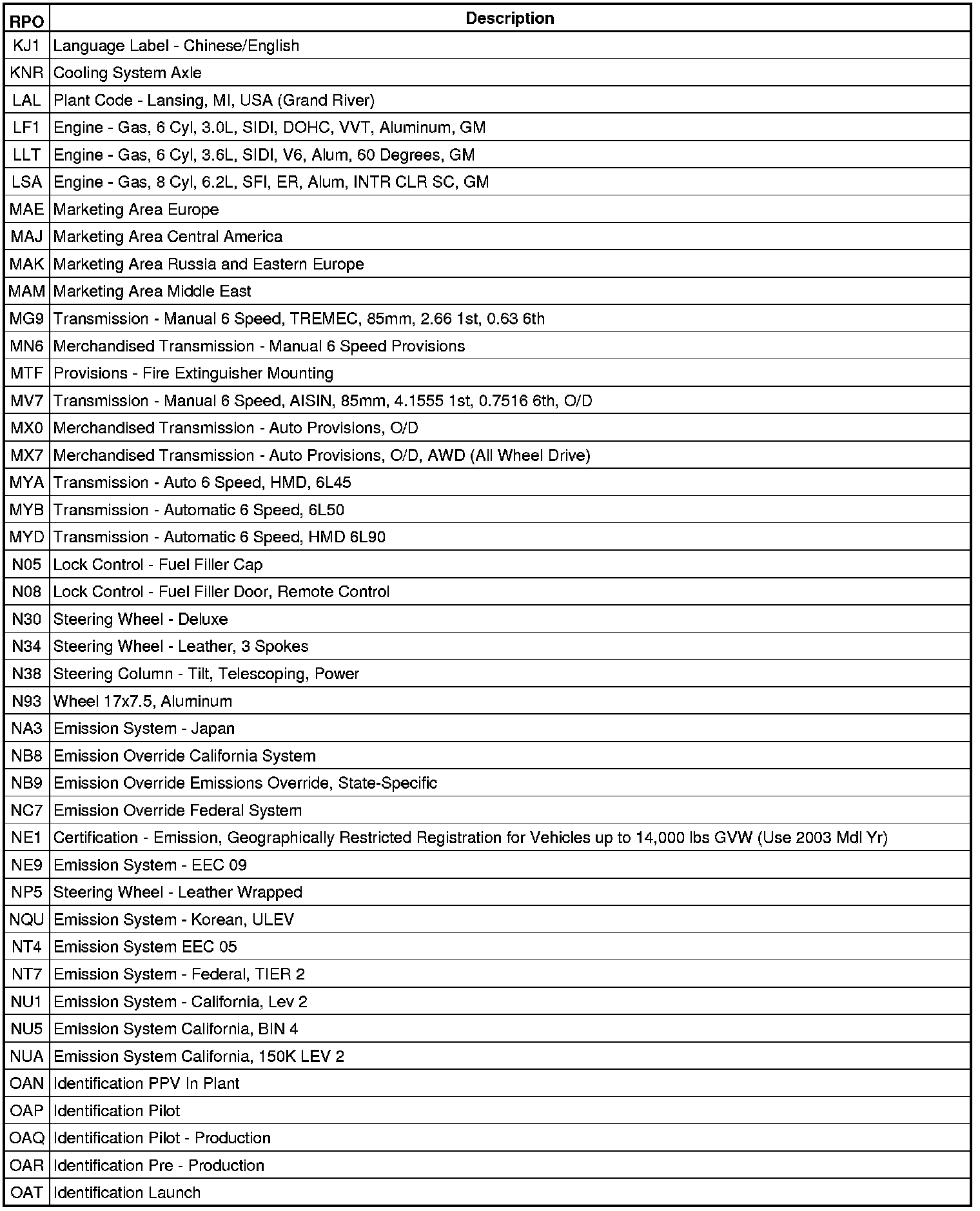 The following table provides the description of the regular production option (RPO) codes that are available on the vehicle. The vehicle's RPO list is printed on the Service Parts Identification Label.