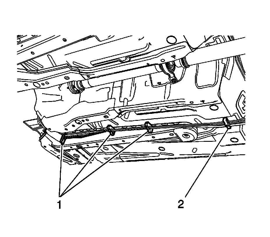 14. Install the fuel and brake pipe bundle retainer (2) to the vehicle underbody.
