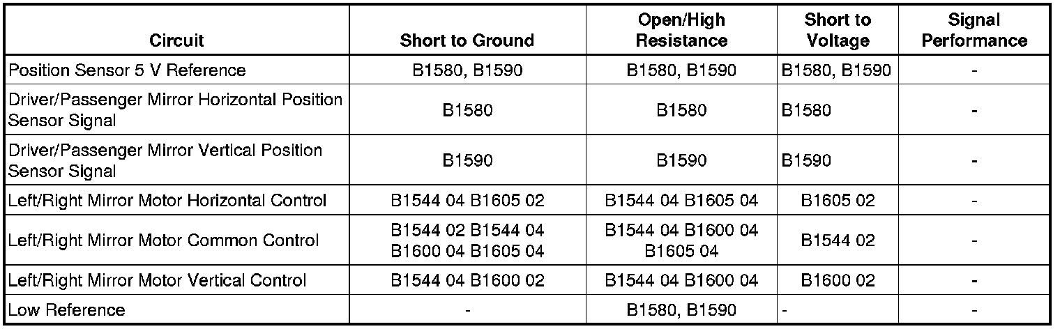• If a mirror does not adjust to the stored memory setting, refer to Mirror Position Sensor Circuit Test.
