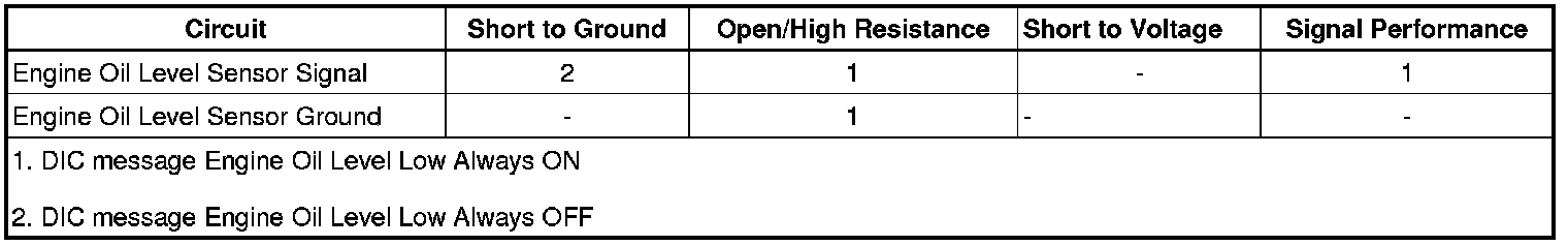 The engine oil level sensor/switch is a normally-closed with proper engine oil level. The switch opens when the engine oil level drops below a calibrated level. The engine control module (ECM) monitors the engine oil level signal circuit when the ignition is ON, and the engine is OFF. With the switch in the closed position, the ECM detects a low voltage signal circuit. With the switch in the open position, the ECM detects a high voltage on the signal circuit. When high voltage is detected on the signal circuit, the ECM will send a serial data message to the instrument panel cluster and a message is displayed on the driver information center.