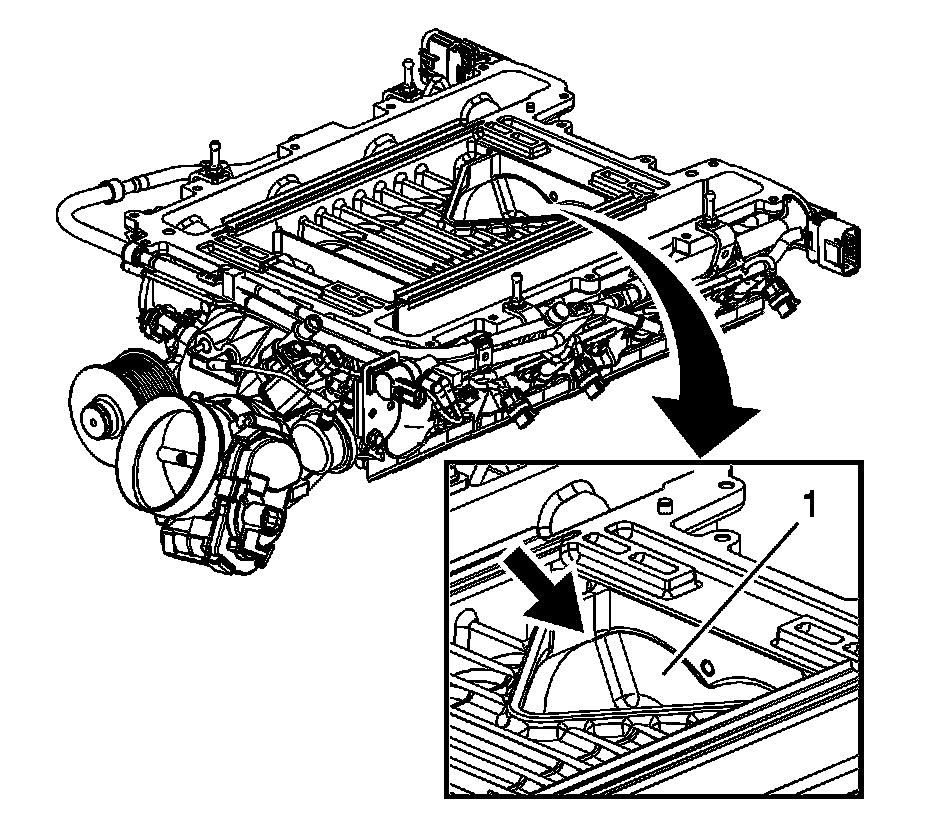 16. Install the positive crankcase ventilation (PCV) - dirty air hose (1) to the valley cover and supercharger.