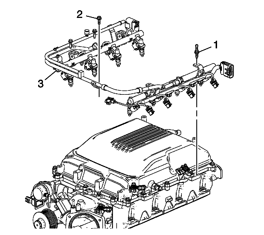 4. Install the wiring harnesses (2) and (3) onto the fuel rail (1).