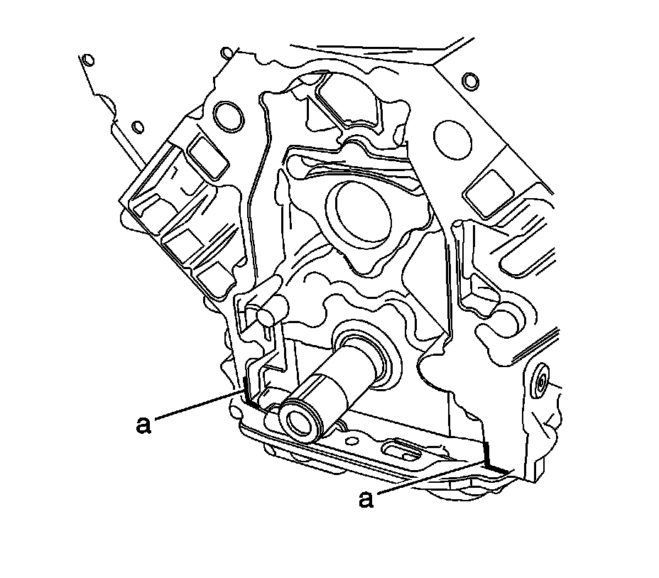 1. Apply a 5 mm (0.2 in) bead of sealant 20 mm (0.8 in) long to the engine block. Apply the sealant to the T joint location (a) where the oil pan meets the front of the engine block. Refer to Adhesives, Fluids, Lubricants, and Sealers (Adhesives, Fluids, Lubricants, and Sealers) for the correct part number.
