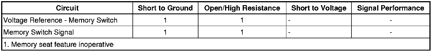 Battery positive voltage is supplied to the memory function switch from the driver door module (DDM). When a memory switch is pressed, battery voltage is applied through the switch contacts, a series of resistors, and thorough the memory switch signal circuit to the DDM. The door control module then sends a serial data message to the memory seat module (MSM) indicating the memory recall request. The MSM then commands the appropriate seat motors to move to the pre-recorded seat positions stored in memory in response to the switch input.