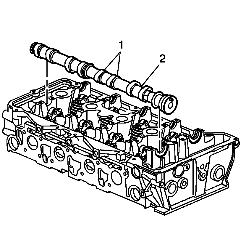 3. Apply a liberal amount of lubricant GM P/N 12345001 (Canadian P/N 992704) or equivalent to the camshaft lobes (1) and the camshaft journals (2).