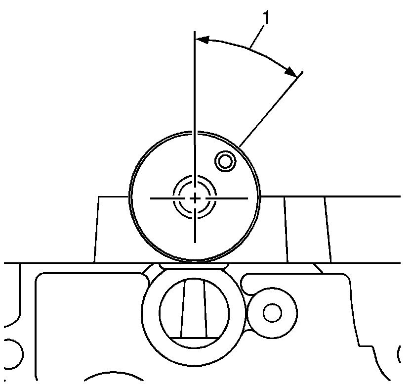 4. Place the camshaft in the camshaft journals with the camshaft sprocket drive pins near the 45-60 degree location (1), clockwise from the top of their rotation and the camshaft lobes in a neutral position. The camshaft can be identified by a stamping near the rear journal. For example: R-EXH is defined as right bank exhaust.