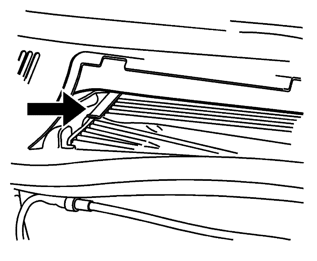 3. To remove the air filter, insert a tool between the air filter and the compartment wall on the outboard side of the vehicle. Then, push in to flatten the pin holding the air filter in place. Gently remove the air filter and any loose debris that may be inside the air filter compartment.