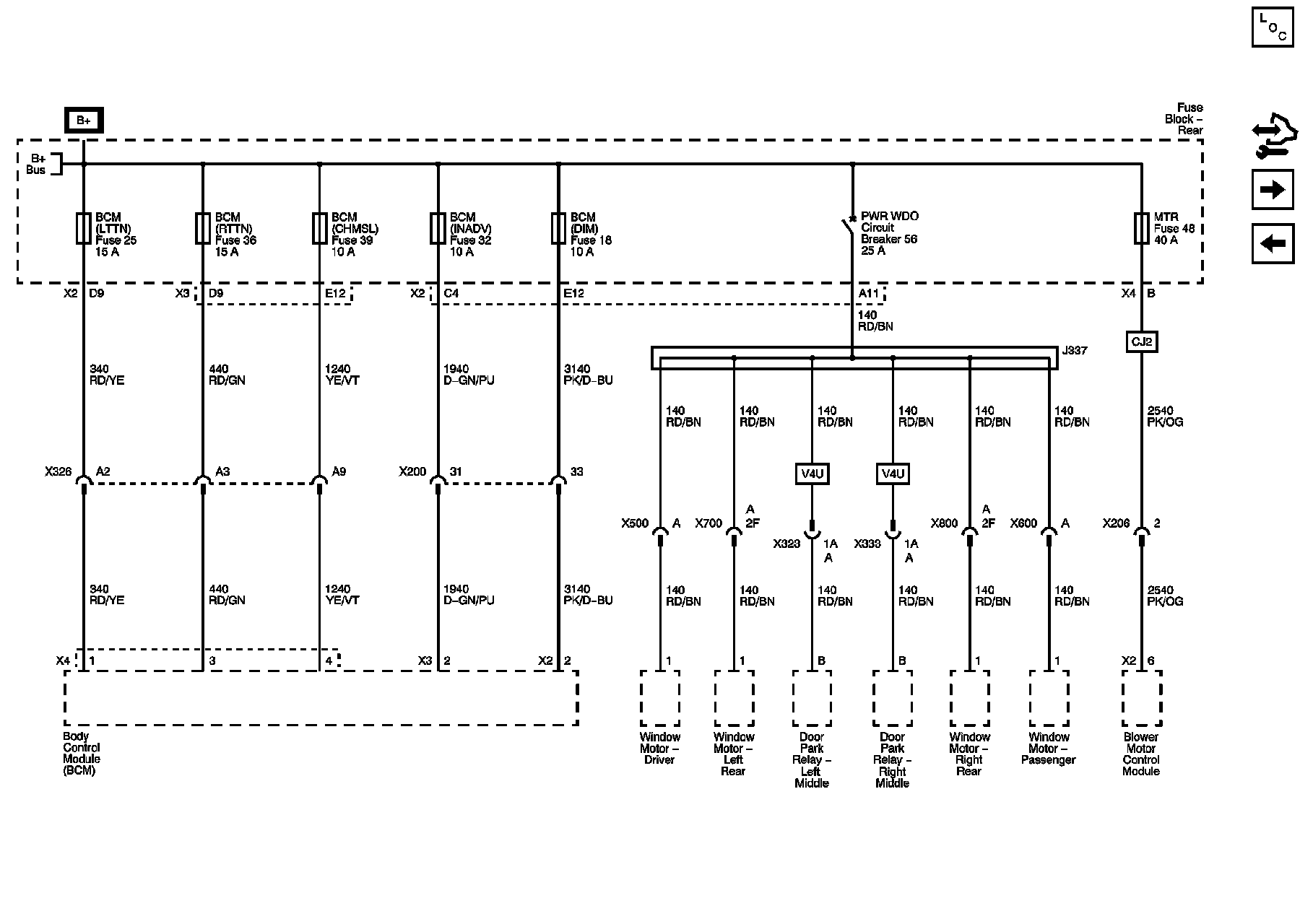 Rear Fuse Block - LT TRN/SIG, RR TRN/SIG, CHMSL/BCK-UP, INT LAMPS, SWTCH DM, HVAC BLWR Fuses, DR MDL/PWR WNDW Circuit Breaker