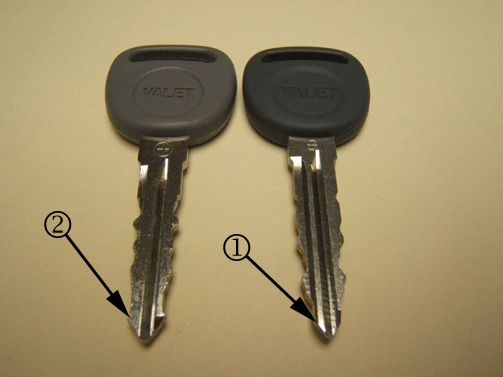 The profile of the new valet key has been changed so that it will not fit into the glove box lock. The picture below identifies the old valet key (right) with the narrow profile (1) and the new valet key (left) with the wider profile (2) which prevents the key from fitting into the glove box lock.