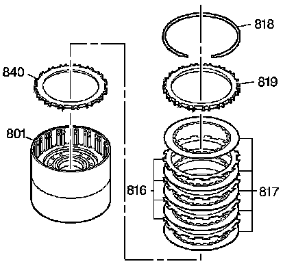 39. Remove the forward and coast clutch backing plate (819), and all of the forward clutch fiber (817) and steel (816) plates. Remove the apply plate (840).