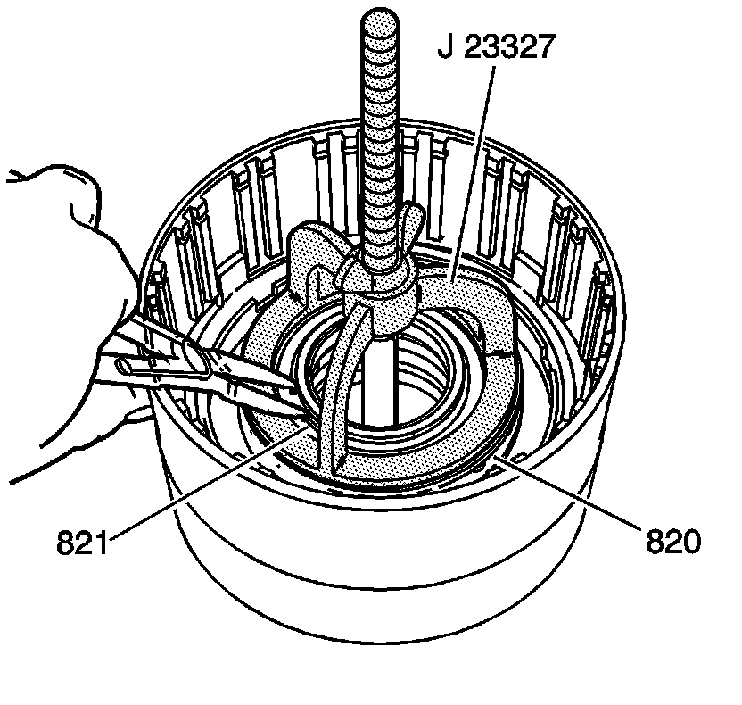 62. Using the J 23327 - spring compressor , compress the spring and retainer assembly (820). Install the snap ring (821).