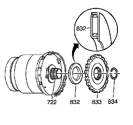 85. Install the thrust bearing (832), the parking lock gear (833), and the snap ring (834) onto the final drive sun gear shaft (722).
