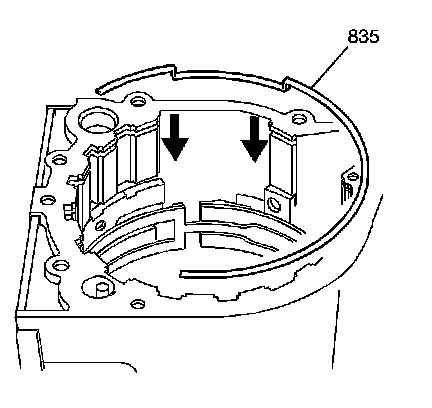 2. Install the fretting ring (835) into the case. Keep the gap in the fretting ring toward the bottom pan with the recessed area next to the anchor pin.