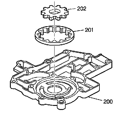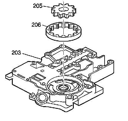 3. Inspect the pump gears (201, 202, 205, 206). These gears must be installed with the dimples facing up.