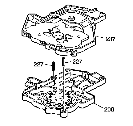 4. Install the scavenge pump cover (237) onto the primary pump body (200) over the dowel bushings (227). Tap the dowels in place to that they stick out of both the primary pump body and the scavenge cover.