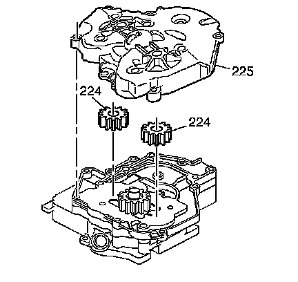 8. Align the scavenge pump driven gears (224) next to the drive gear (223). Install the scavenge pump body (225) onto the scavenge pump cover. Locate the scavenge pump driven gear pins into the scavenge pump driven gears (224). Press firmly into position.