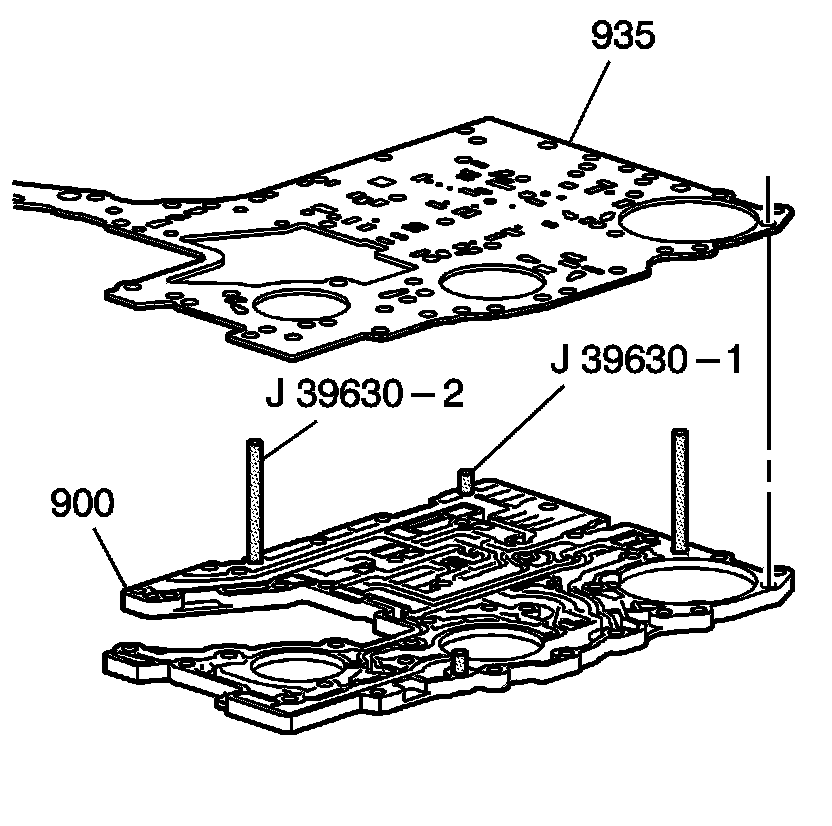 3. Insert the J 39630-1 - guide pins into the lower channel plate (900) and rest the channel plate on the guide pin heads.