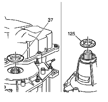 2. Using the J 39051-1 - right seal driver and the J 39051-2 - left seal driver , install the new axle seals (37, 125). Use the output shaft (57) to pilot the seals and the tool into the case. Ensure that the snap rings are installed on the output shaft.
