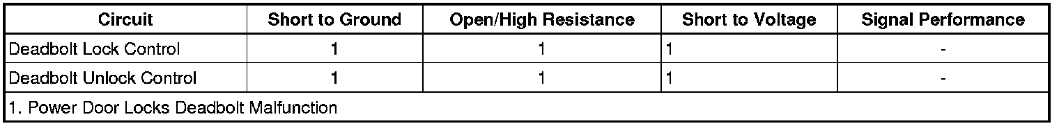 Export vehicles may be equipped with the deadbolt feature, which includes a reversible deadbolt motor contained within each door latch assembly. Each deadbolt motor is wired to their respective door modules through 2 circuits, the deadbolt lock control circuit and the deadbolt unlock control circuit. To deadbolt a door, the body control module (BCM) locks the door by momentarily applying voltage to the door latch motor control circuit. To complete the deadbolting, the door module momentarily applies voltage to the deadbolt lock control circuit and ground to the deadbolt unlock control circuit. If the content theft feature is armed at the same time, the interior door lock switches will not operate the locks.