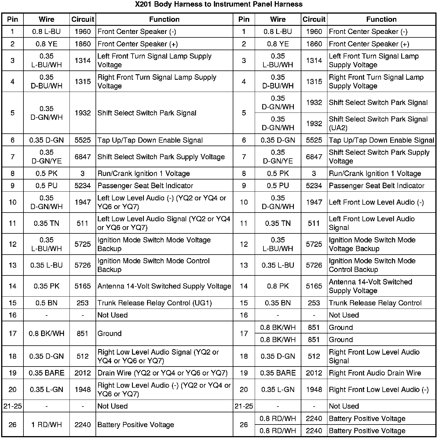 X201 Body Harness to Instrument Panel Harness