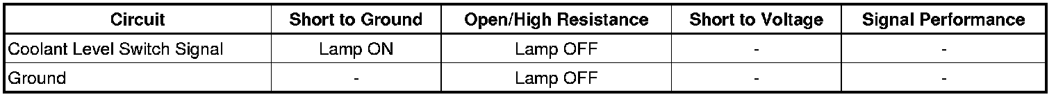 The engine cooling system contains an engine coolant level switch to alert the driver in the event of a low coolant level. The coolant level switch is mounted at the lowest point in the cooling system surge tank. If the amount engine coolant in the surge tank drops below the level of the switch, the coolant level switch opens. The coolant level switch signal circuit is monitored by the heating, ventilation, and air conditioning (HVAC) control module. If the HVAC control module detects an open circuit, or a high voltage condition on the signal circuit for greater than 10 seconds, a Class 2 message is sent to the radio, requesting display of the low coolant level message.