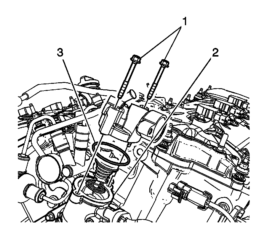 8. Remove the thermostat (2) and discard the thermostat seal (3).