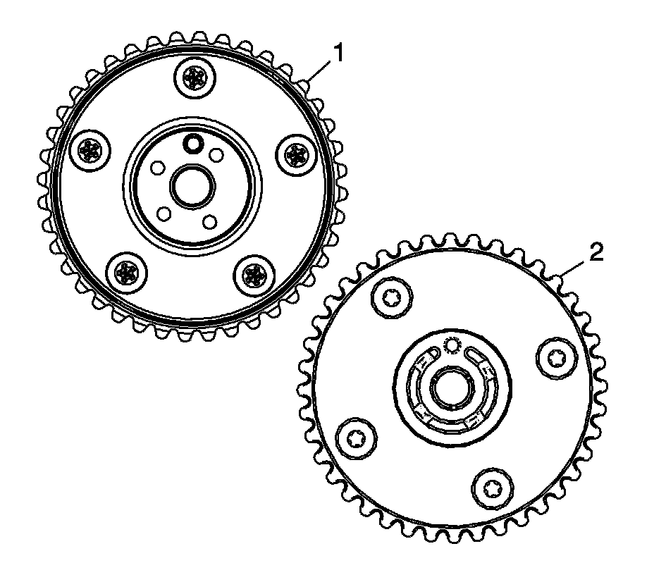 2. Ensure the proper camshaft position actuator is being installed. The reluctor wheel on the right intake camshaft position actuator (1) is indexed in a different position compared to the left intake camshaft position actuator (2).
