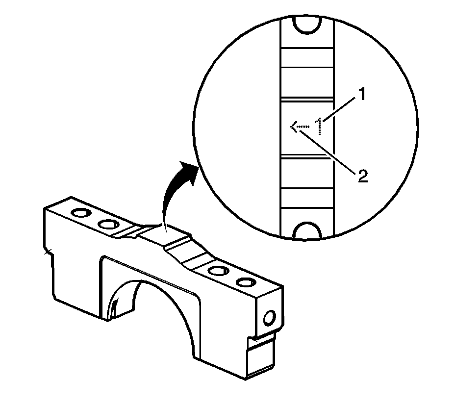 2. Identify the proper order of the main bearing caps. The main bearing caps are numbered 1 (1) through 4, with the front main bearing cap marked with the number 1. The arrow (2) is to be oriented to the front of the engine.