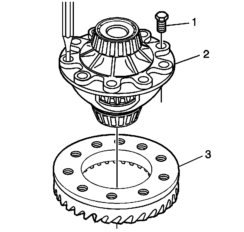 1. Remove the 10 ring gear bolts (1) and the ring gear (3) from the differential carrier (2) using a punch and a hammer through the bolt hole. Discard the ring gear bolt (1).