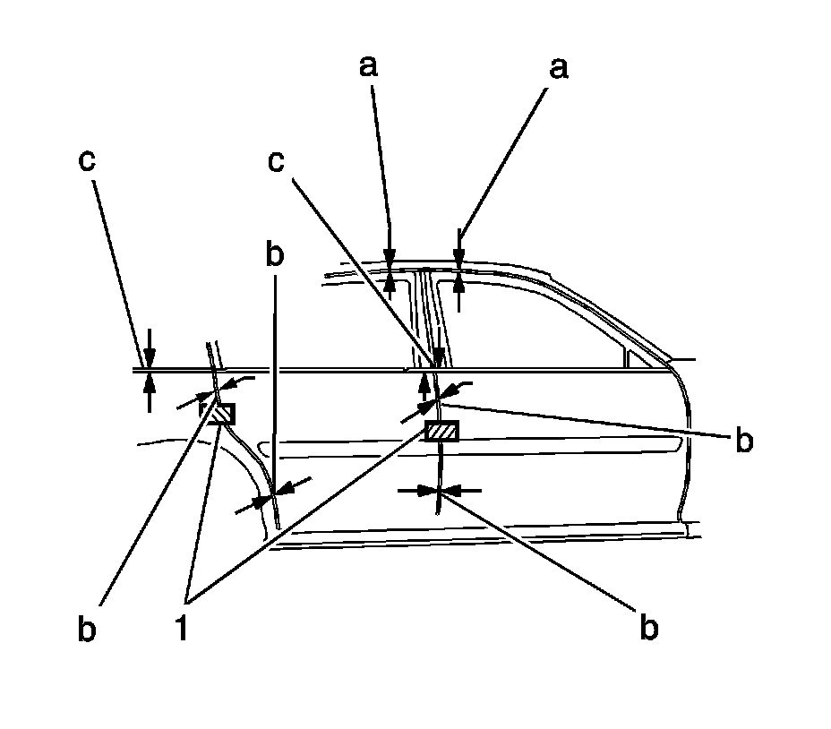 5. If in or out adjustment is needed, remove the door hinge. Refer to Front Side Door Upper Hinge and Lower Hinge Replacement (Service and Repair) or Rear Side Door Upper Hinge and Lower Hinge Replacement (Service and Repair).