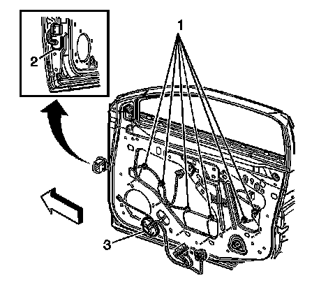 1. Remove the door trim panel. Refer to Rear Side Door Trim Panel Replacement (Rear Side Door Trim Panel Replacement).