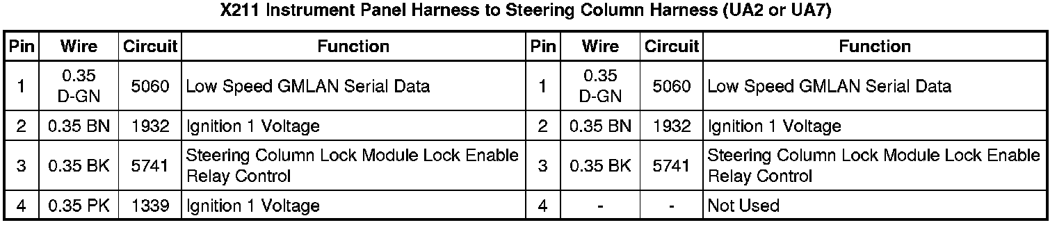 X211 Instrument Panel Harness to Steering Column Harness (UA2 or UA7)
