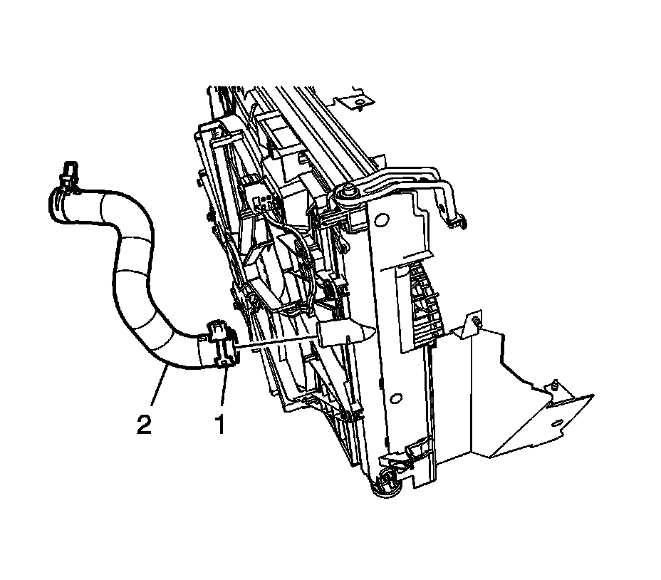 7. Connect the radiator outlet hose (2) to the radiator. Use J 38185 - Hose Clamp Pliers to position the radiator outlet hose clamp (1) to secure the hose.