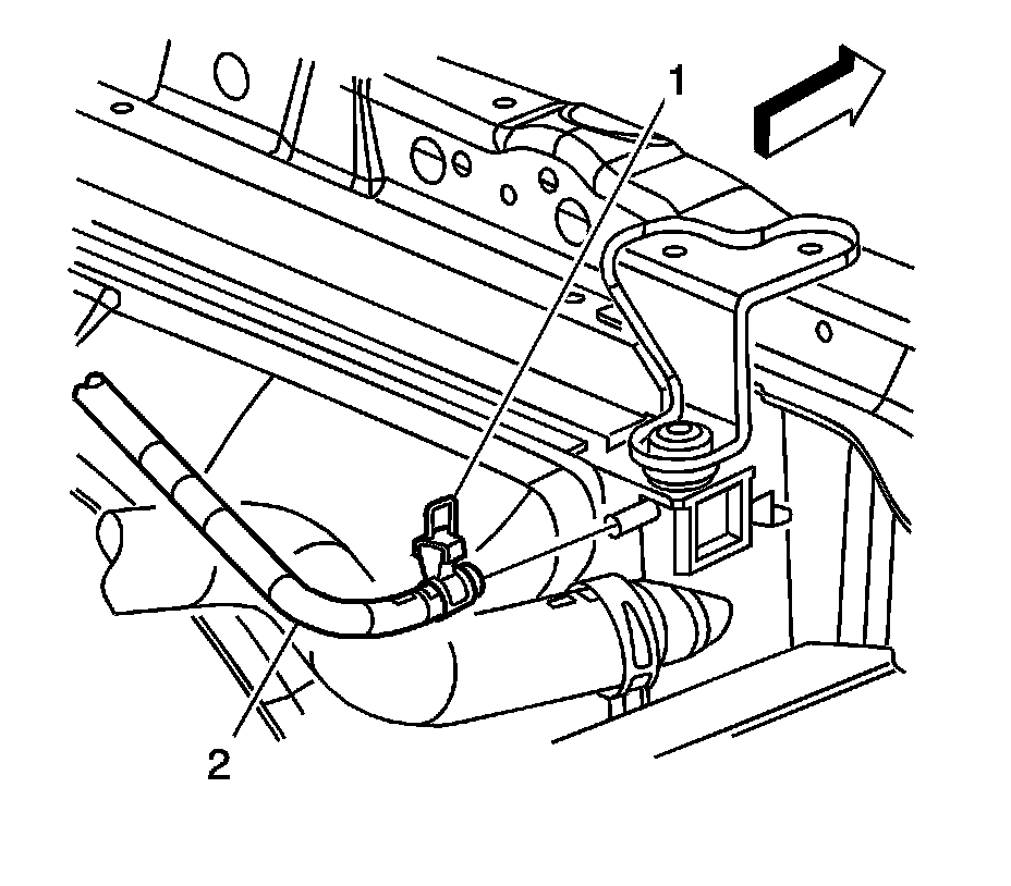 8. Use J 38185 - Hose Clamp Pliers to disengage the tension on the hose clamp (1). Remove the radiator outlet hose (2) from the radiator.
